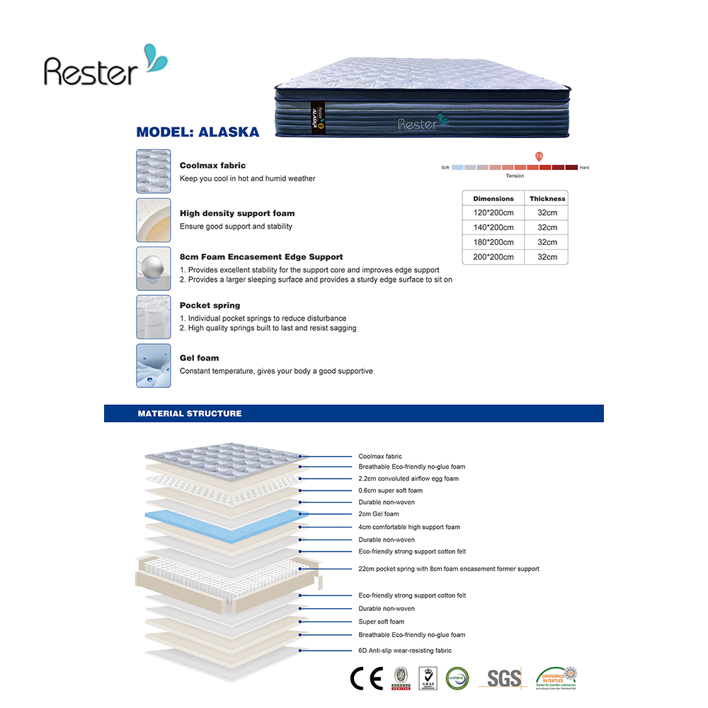 - تتميز مرتبة الاسكا بطبقة اسفنج باردة ومثالية لأصحاب النوم الخفيف أو من يعانون من التعرق الليلي.